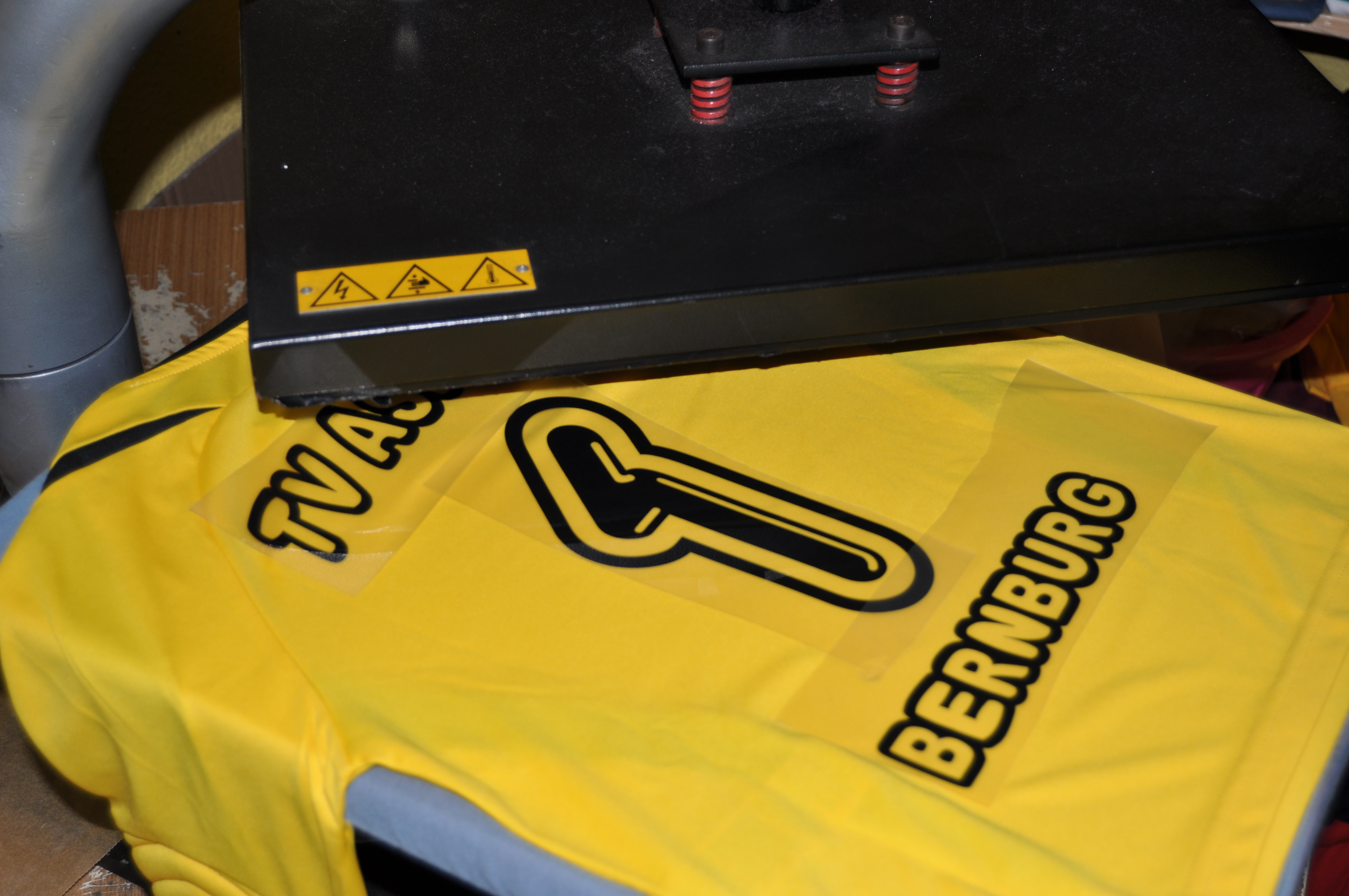 Hierbei werden die Überreste, die nicht gedruckt werden sollen, von der selbstklebenden Flexfolie entfernt, so dass letztendlich nur noch das gewünschte Motiv sichtbar ist. Letztlich wird die Trägerfolie mit dem Farbmotiv, das zuvor entgittert wurde, auf das Textil gelegt und mittels Transferpresse unter Druck und Hitze auf das Textil gedruckt.